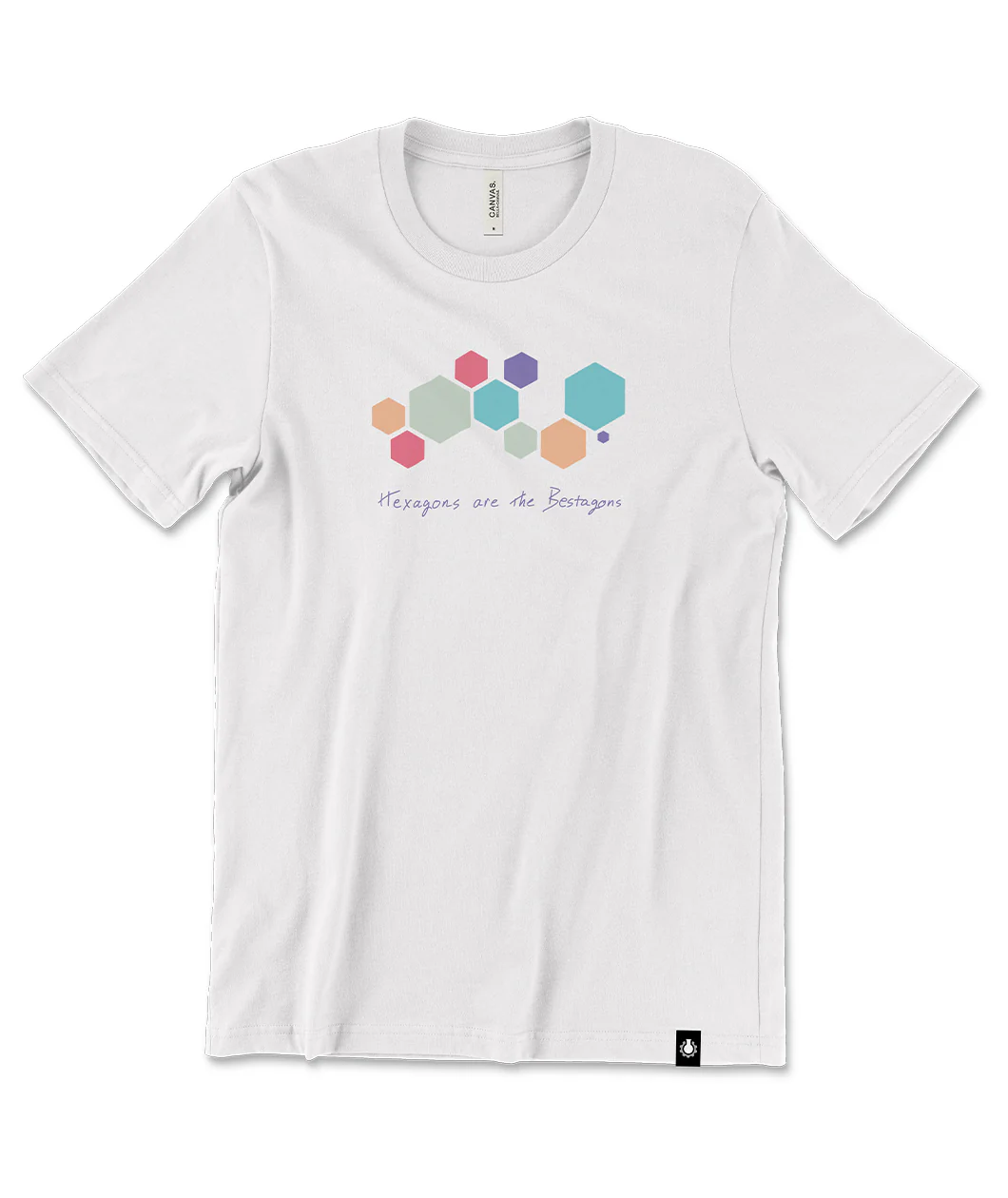 No squares here. This design is composed of a colorful assortment of the very best shape. Complete with the phrase “Hexagons are the bestagons” hand-lettered by Grey himself. Grab the brand new grey version of this CGP Grey classic.