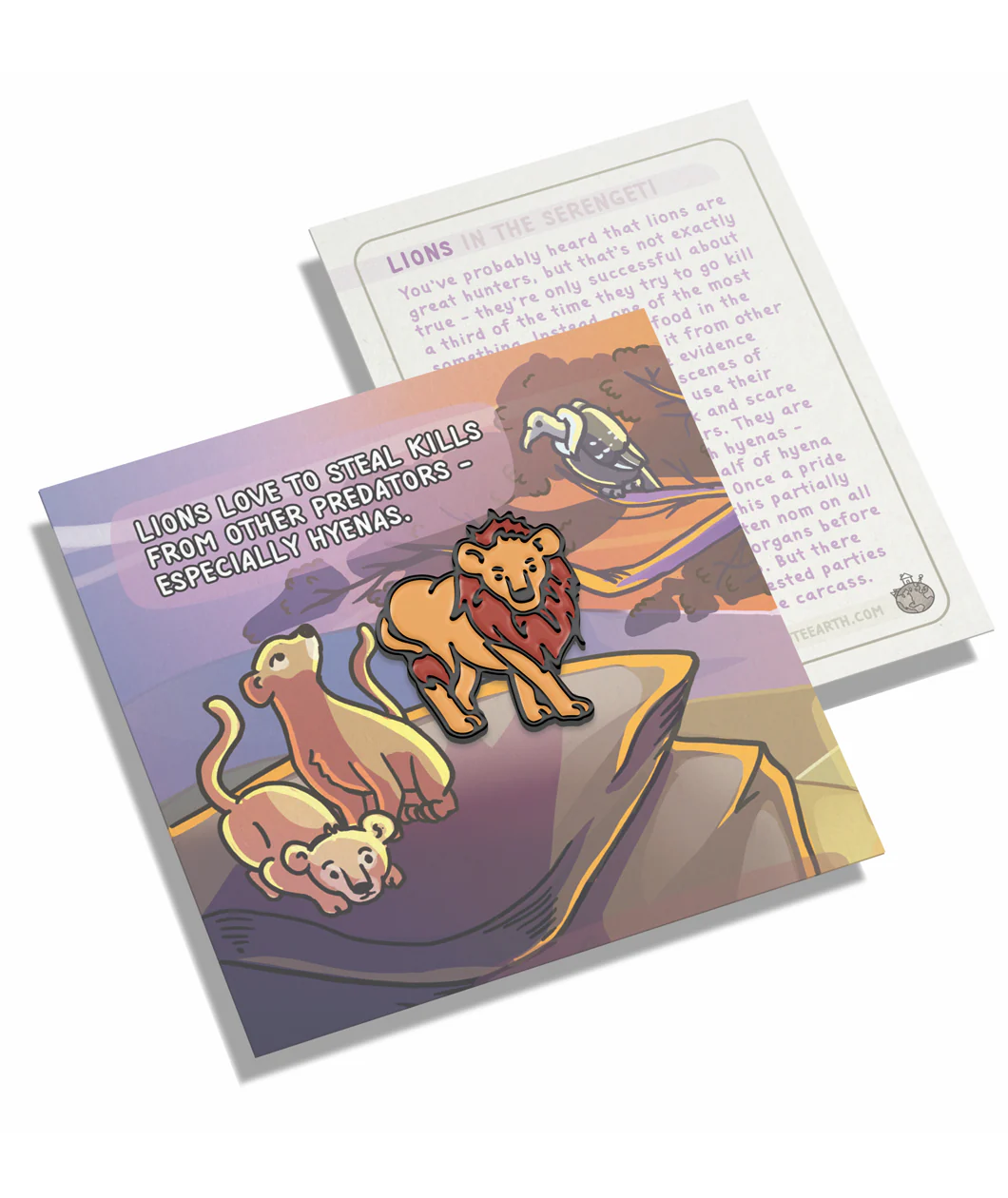 The Serengeti plains are full of life… and death. Collect all four black metal plated enamel pins to learn about the unique circle of life in the Serengeti. Each pin comes with a story card detailing that animals role in the wild. And once you use your pins, the background artwork of all four fit together to create a scene that you can continue to admire or display.