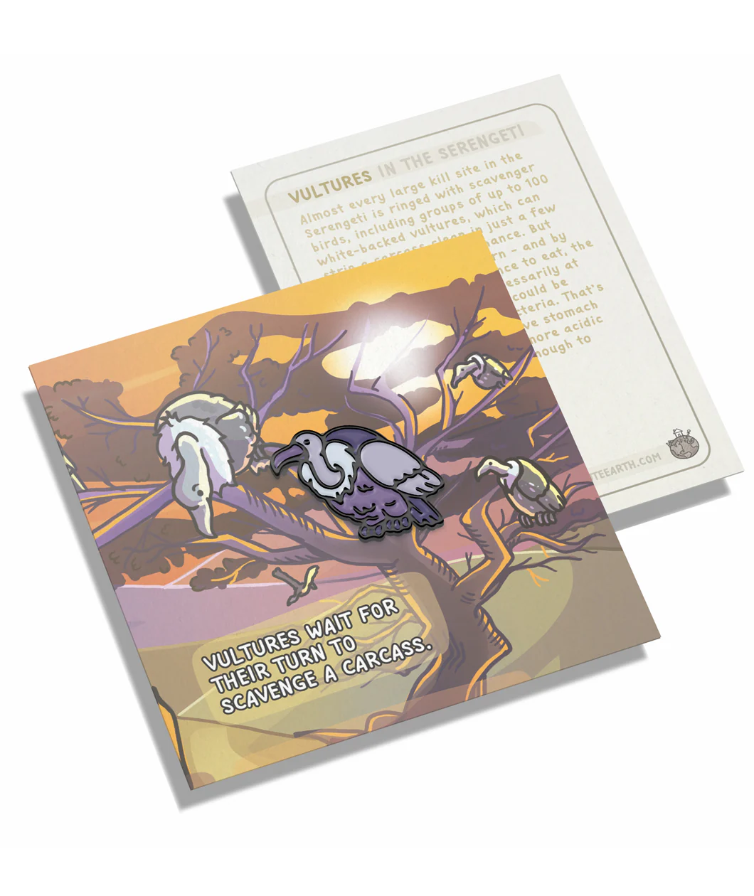 The Serengeti plains are full of life… and death. Collect all four black metal plated enamel pins to learn about the unique circle of life in the Serengeti. Each pin comes with a story card detailing that animals role in the wild. And once you use your pins, the background artwork of all four fit together to create a scene that you can continue to admire or display.