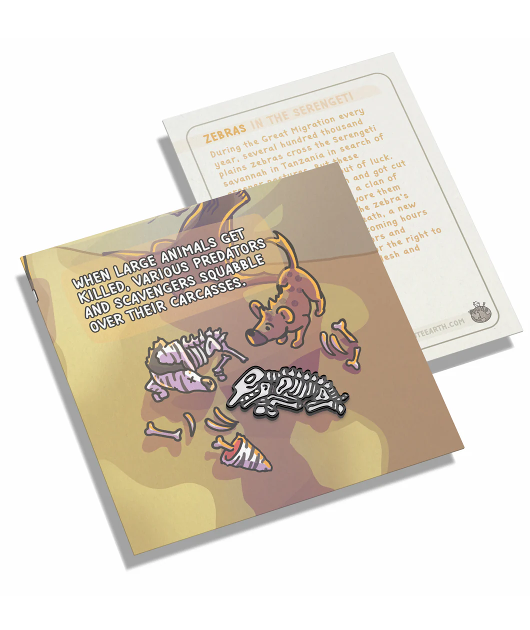 The Serengeti plains are full of life… and death. Collect all four black metal plated enamel pins to learn about the unique circle of life in the Serengeti. Each pin comes with a story card detailing that animals role in the wild. And once you use your pins, the background artwork of all four fit together to create a scene that you can continue to admire or display.